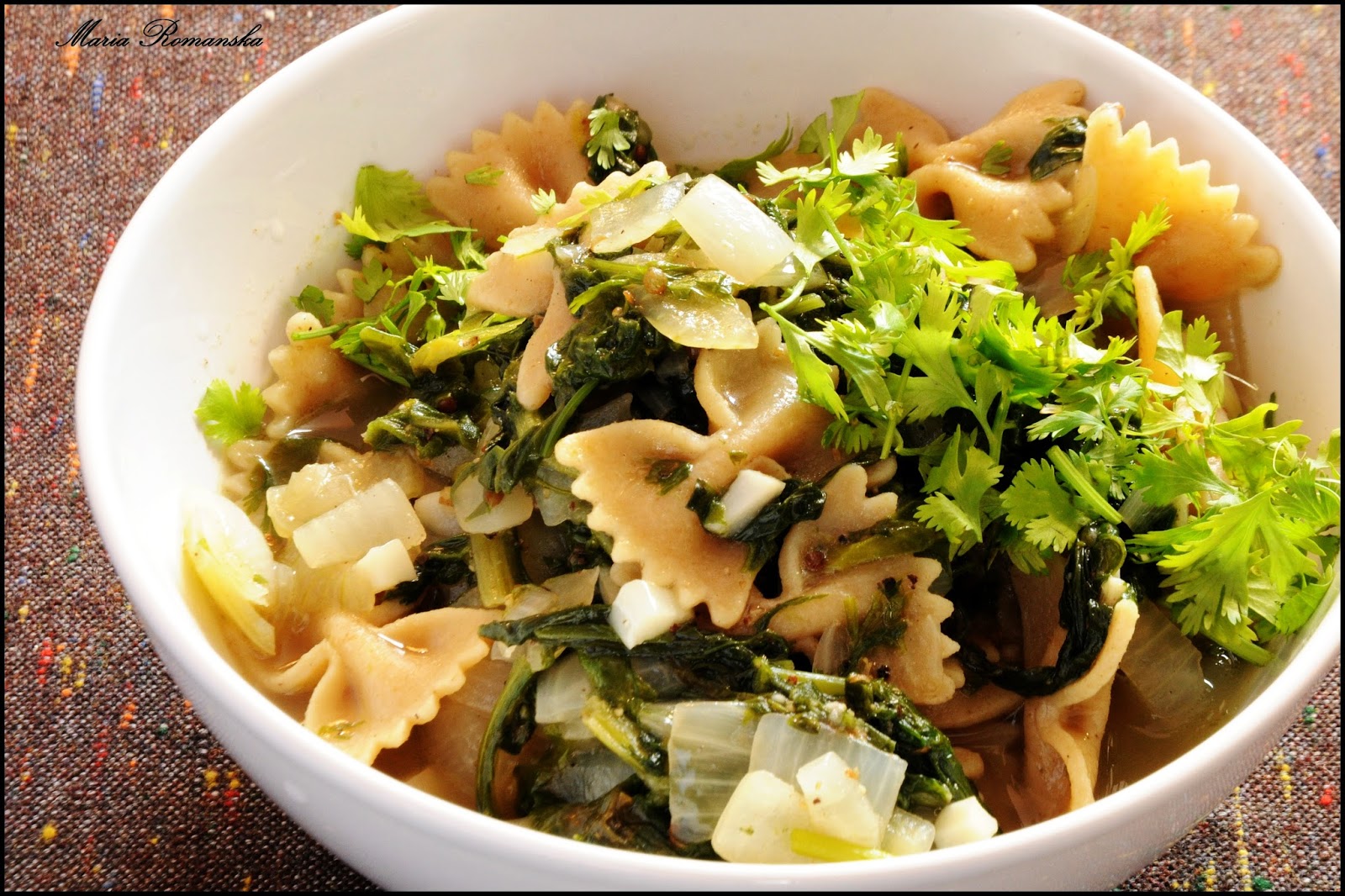 Makaron, wiadomo, reprezentuje włoski brzeg natomiast szpinak przyrządziłam w sposób w jaki np. w Syrii przyrządza się jutę występującą m.in. pod nazwą  Muluchije.
